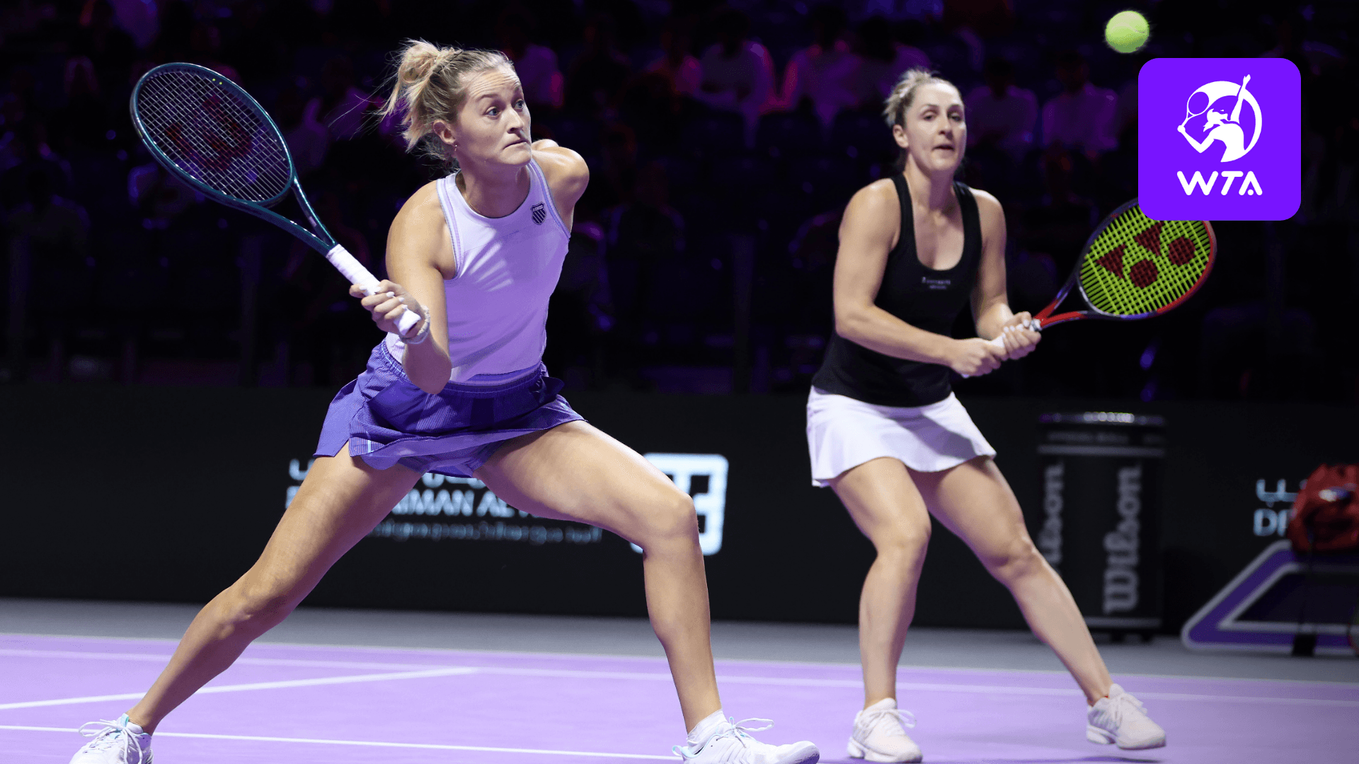 الفريق المكوّن من الكندية غابرييلا دابروفسكي والنيوزيلندية إيرين روتليف يواجه الثنائي الإيطالي المكوّن من سارا إيراني وجاسمين باوليني في نهائيات رابطة محترفات التنس (WTA) في الرياض، المملكة العربية السعودية.