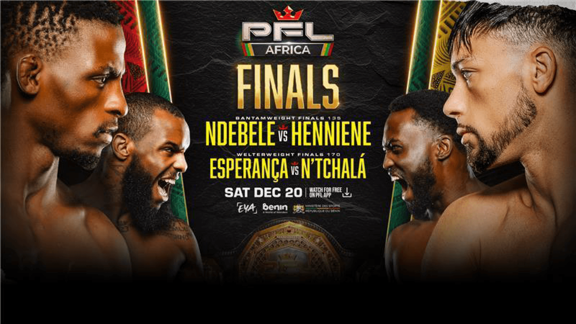 Watch the final PFL Africa event of 2025 from Benin, where Nkosi Ndebele and Karim Henniene top the bill in Bantamweight action.