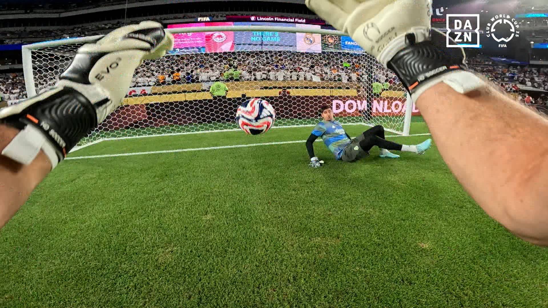 See how the Real Madrid C.F. goalkeepers - starter Thibaut Courtois and substitutes Andriy Lunin and Fran - warmed up for the match against FC Salzburg, which ended in a 3-0 win for Madrid (goals from Vinicius Júnior, Federico Valverde and Gonzalo García) and confirmed that the team coached by Xabi Alonso was in 1st place in Group H of the FIFA Club World Cup and will now face Juventus FC in the round of 16 of the respective competition.