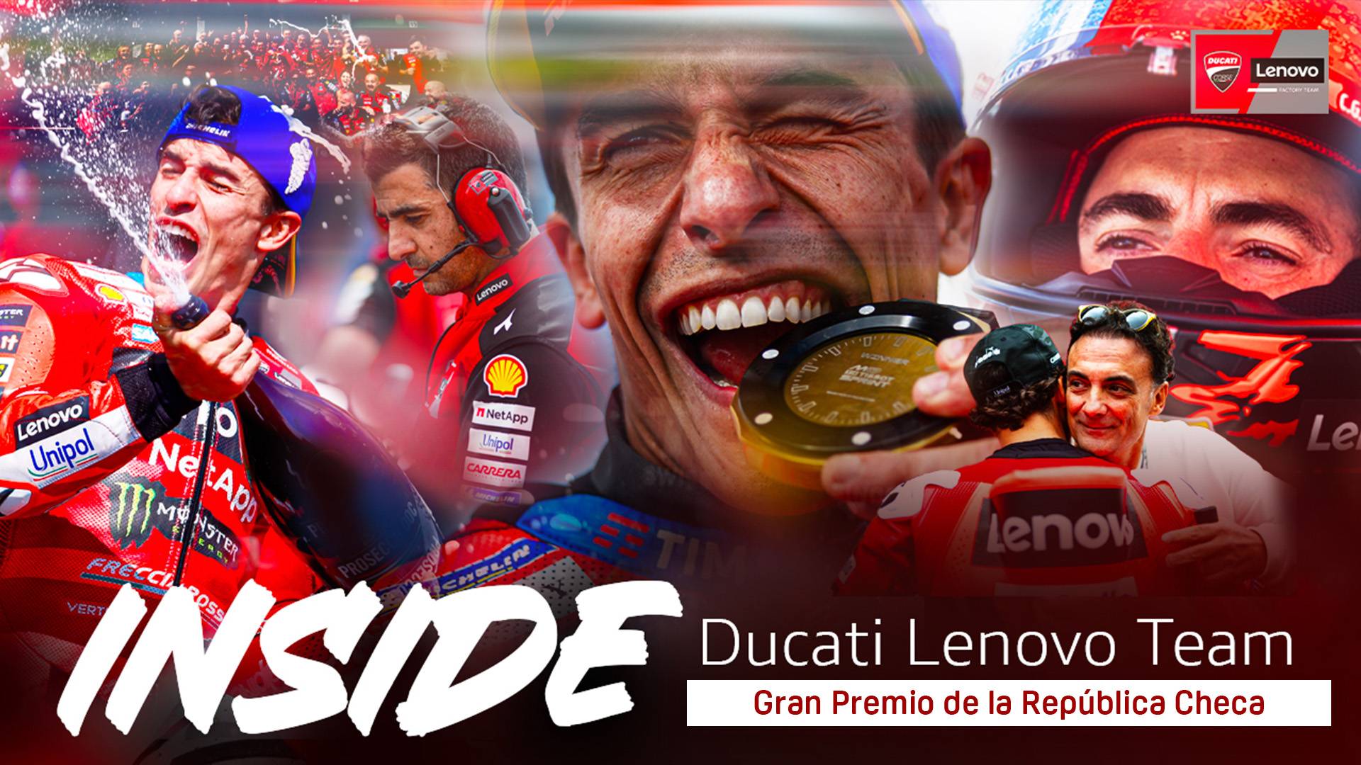 En el Gran Premio de la República Checa, Marc Márquez logró una obra maestra para el Ducati Lenovo Team y escribió una nueva página en la historia de Ducati al convertirse en el primer piloto en ganar cinco Grandes Premios consecutivos en la categoría reina para la fábrica de Borgo Panigale. Una sólida actuación de Pecco Bagnaia, que volvió a la pole position y fue capaz de realizar una gran carrera el domingo tras un sprint difícil en el que tuvo que lidiar con un problema electrónico. Está pasando por dificultades, pero nunca se rinde. Y luego, un día con Pietro Bagnaia, que es un conductor de scooter recomendado, celebraciones de cumpleaños y una actuación increíble e inolvidable de la que la Reina y David Bowie se sentirían orgullosos sin duda... ¡Esto es Under Pressure! 12.º GP y 12.º episodio de la serie INSIDE Ducati Lenovo Team. Una mirada entre bastidores para compartir con todos los Ducatis el ambiente real de esta emocionante temporada 2025 de MotoGP.