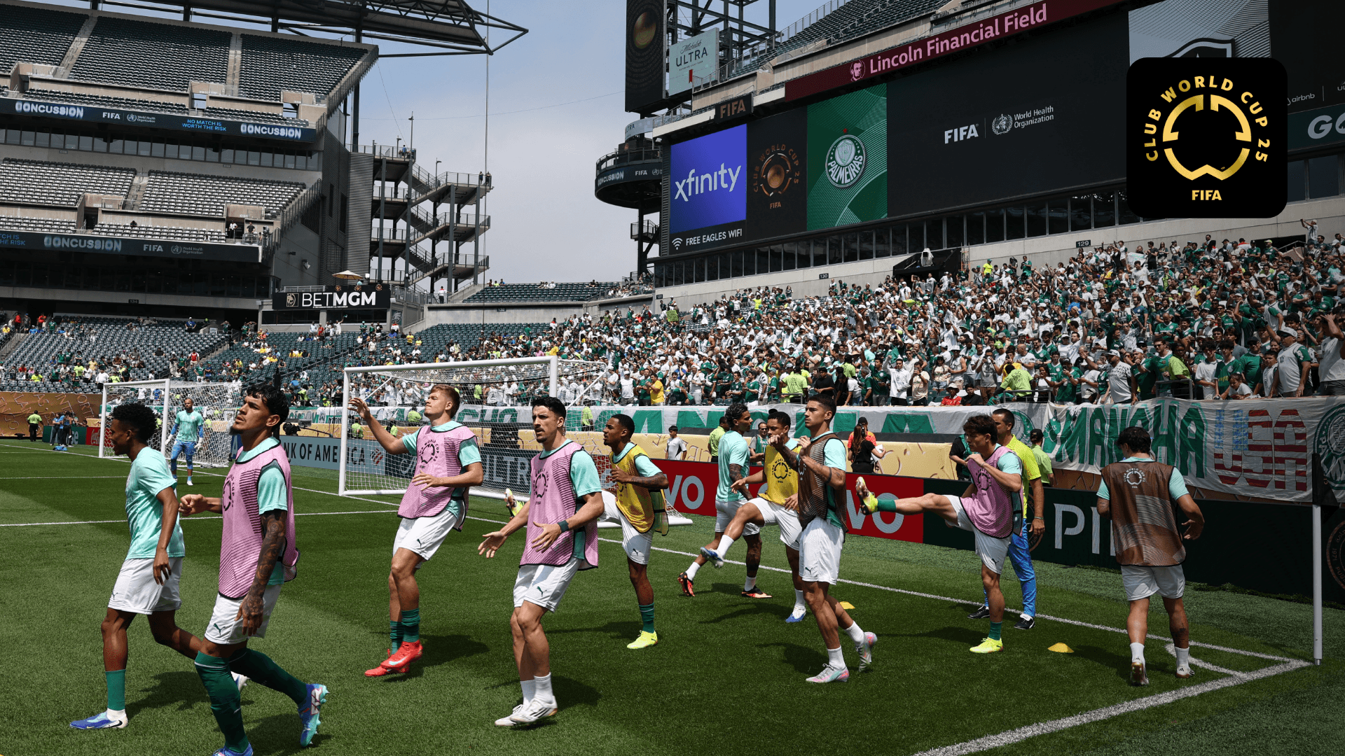 Mira las imágenes del equipo de Palmeiras llegando a los vestuarios del Lincoln Financial Field en Filadelfia, con música icónica para animarlos.
