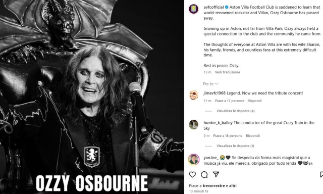 L'Aston Villa saluta Osbourne, il suo tifoso più speciale: "Riposa in pace, Ozzy"