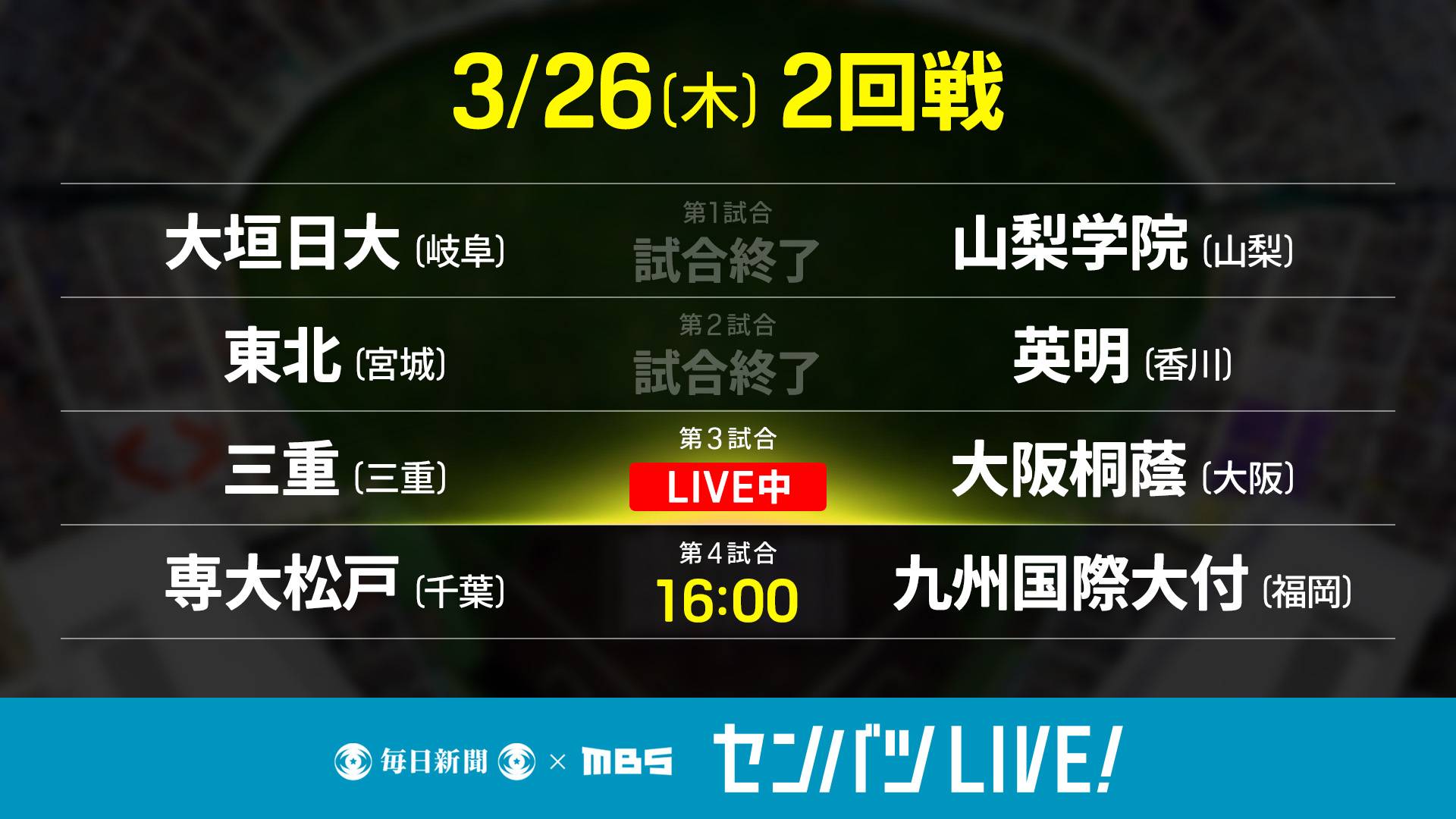 【MC:赤星憲広 アシスタント: 上田芹莉(MBSアナウンサー)】第1試合【解説:新納弘治(前関大北陽高監督) 実況:大村浩士(MBSアナウンサー)】大垣日大 (岐阜) vs 山梨学院 (山梨)/第2試合【解説:川崎絢平(明豊高監督) 実況:澁谷祐太朗(MRTアナウンサー)】東北 (宮城) vs 英明 (香川)/第3試合【解説:前田三夫(前帝京高監督) 実況:森本栄浩(MBSアナウンサー)】三重 (三重) vs 大阪桐蔭 (大阪)/第4試合【解説:広岡正信(元関西学院高等部監督) 実況:近藤亨(MBSアナウンサー)】専大松戸 (千葉) vs 九州国際大付 (福岡)