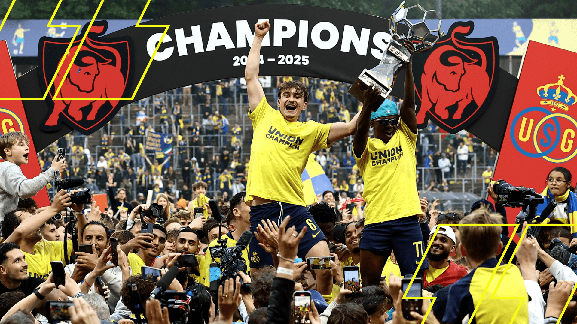 De spelers en staf van Union SG delen hun emoties na het binnenhalen van een historische landstitel. De eerste in 90 jaar.