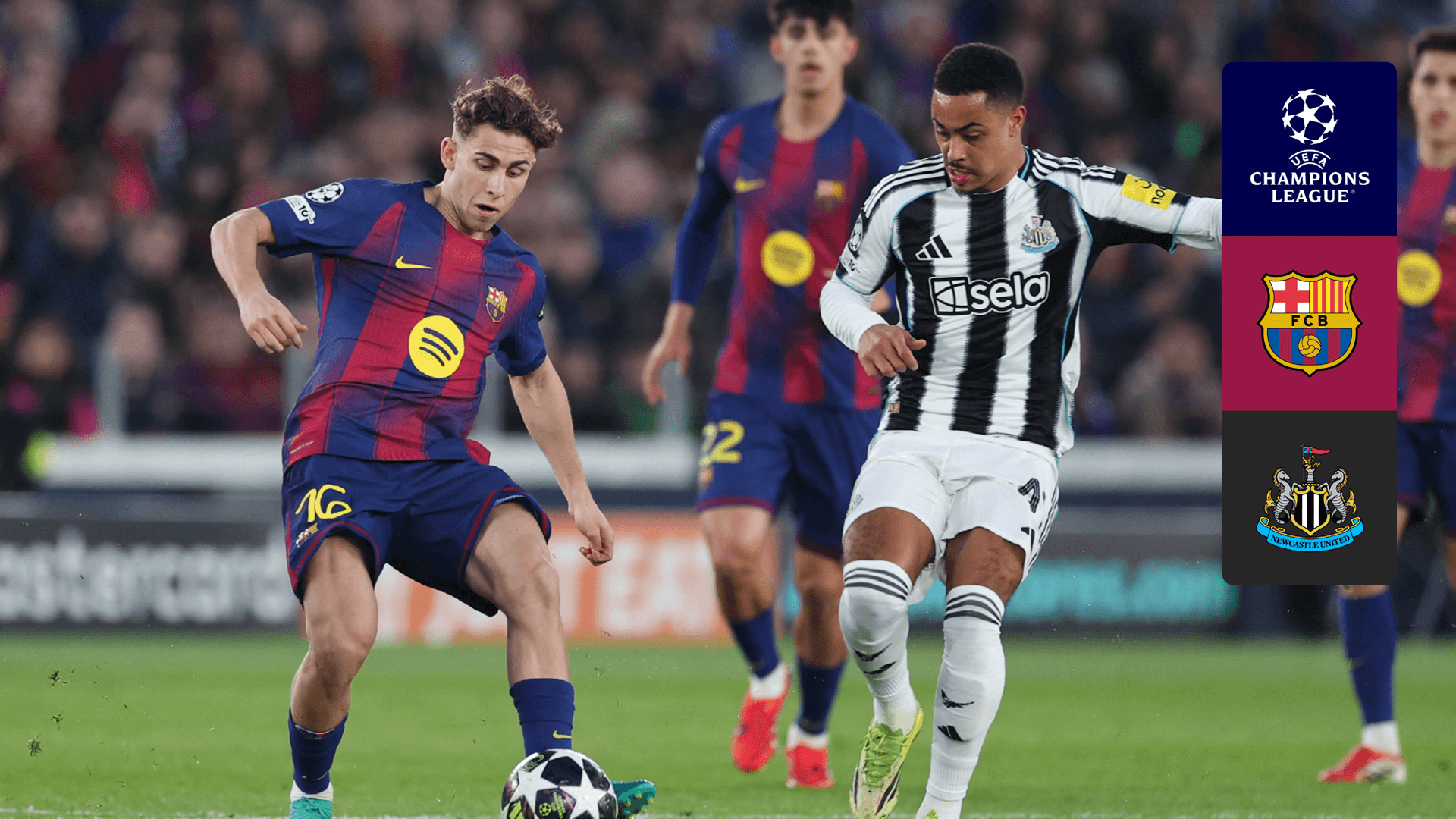 Vê o jogo da 2.º mão dos oitavos de final da UEFA Champions League entre o Barcelona e o Newcastle United.