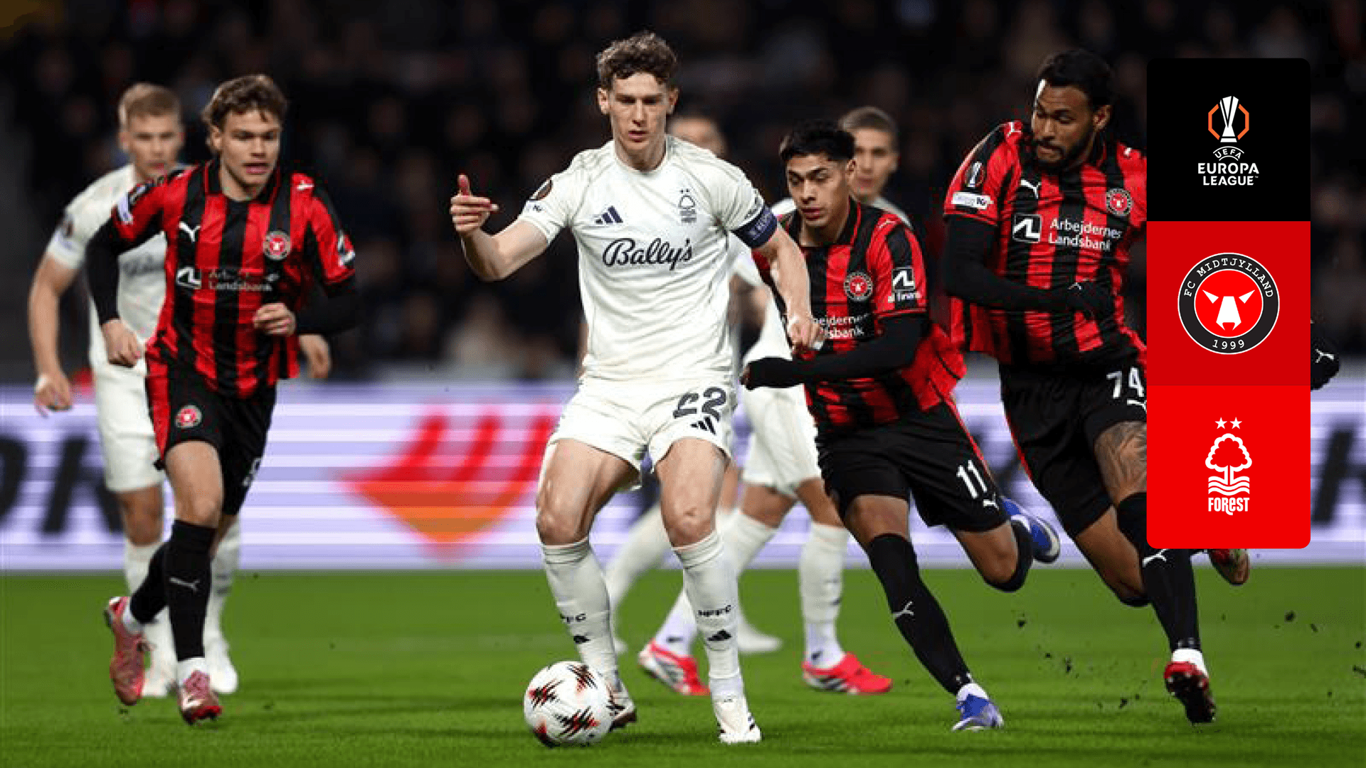 Vê o jogo da 2.º mão dos oitavos de final da UEFA Europa League entre o Midtjylland e o Nottingham Forest.