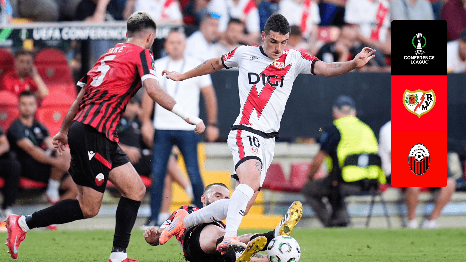 V|e o jogo da fase de liga da UEFA Conference League entre o Rayo Vallecano e o Shkendija.